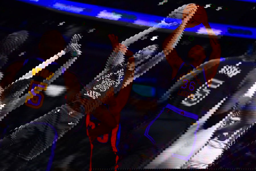 Dec 30, 2025; Los Angeles, California, USA; Los Angeles Lakers guard Marcus Smart (36) shoots against the Detroit Pistons during the second half at Crypto.com Arena. Mandatory Credit: Gary A. Vasquez-Imagn Images