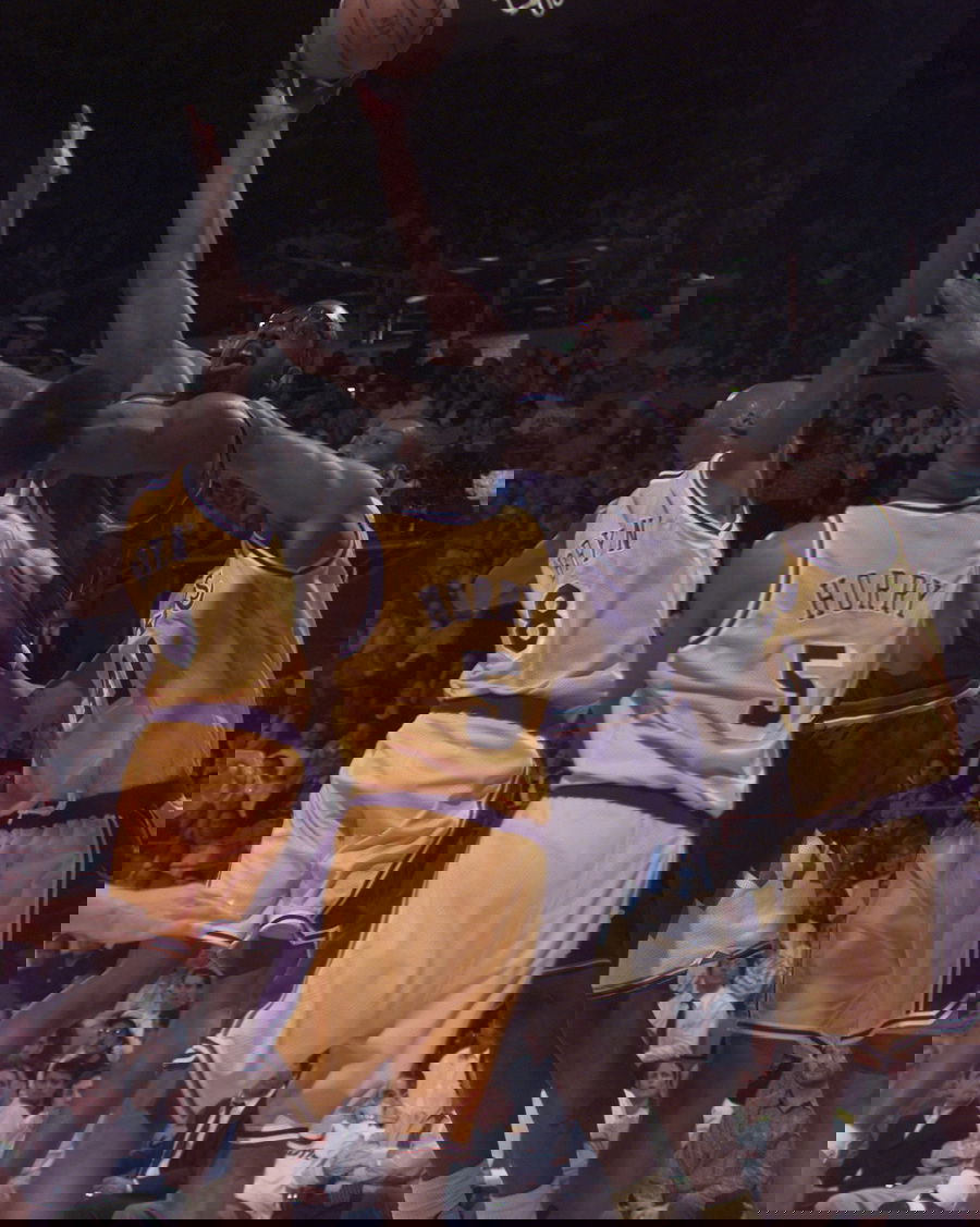 May 8, 1997; Inglewood, CA; Utah’s Antoine Carr puts up a shot between the Lakers’ Kobe Bryant, Robert Horry and Elden Campbell during game 3 of the NBA Western Conference semi-finals. Mandatory Credit: Robert Hanashiro-USA TODAY NETWORK