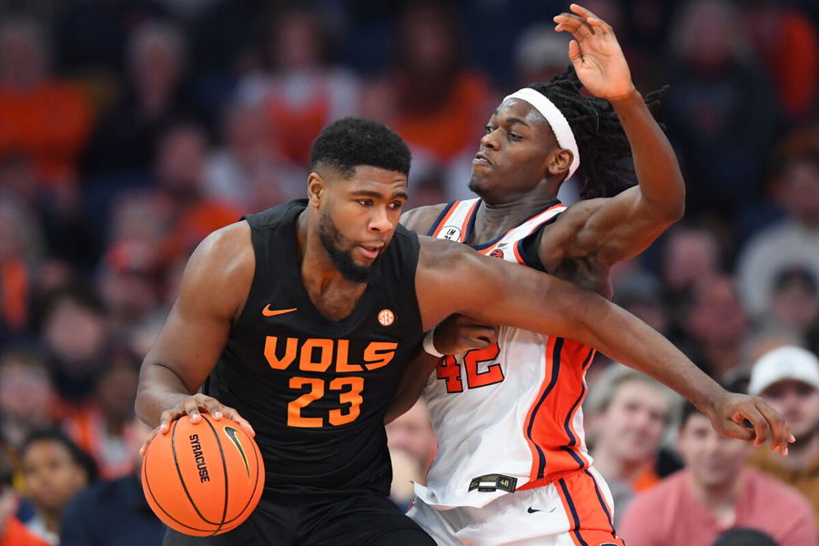 Dec 2, 2025; Syracuse, New York, USA; Tennessee Volunteers forward Jaylen Carey (23) drives against Syracuse Orange forward William Kyle III (42) during the second half at the JMA Wireless Dome. Mandatory Credit: Rich Barnes-Imagn Images
