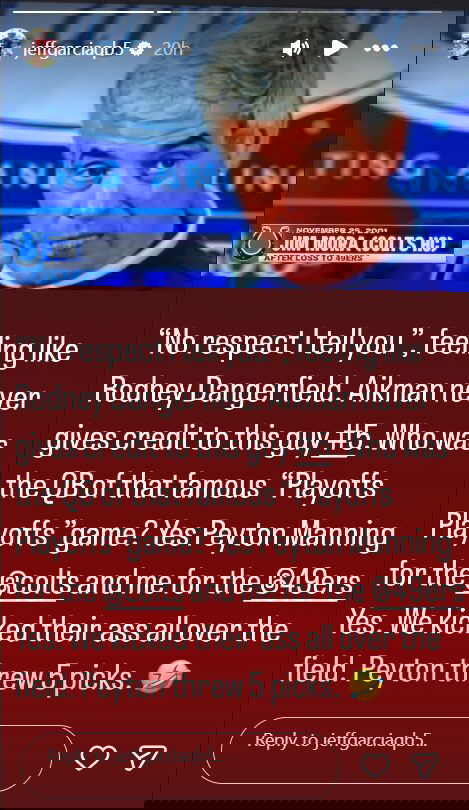 “‘No respect, I tell you,'” shared Garcia on another story, “feeling like Rodney Dangerfield. Aikman never gives credit to this guy #5. Who was the QB of that famous “Playoffs Playoffs” game? Yes Peyton Manning for the @colts and me for the 49ers. Yes. We kicked their ass all over the field. Peyton threw 5 picks.”